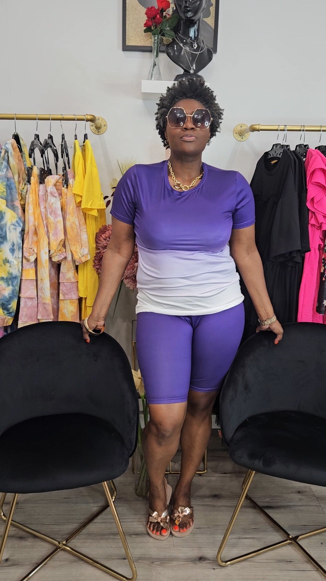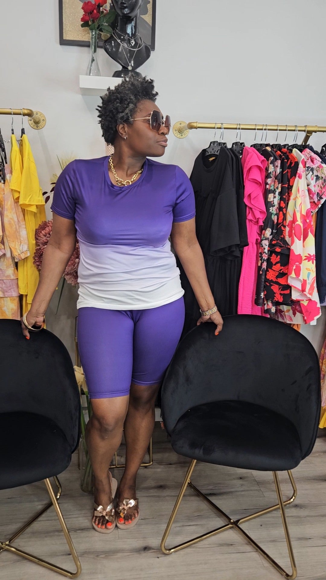 Stretch to fit top and biker short set; crew neck