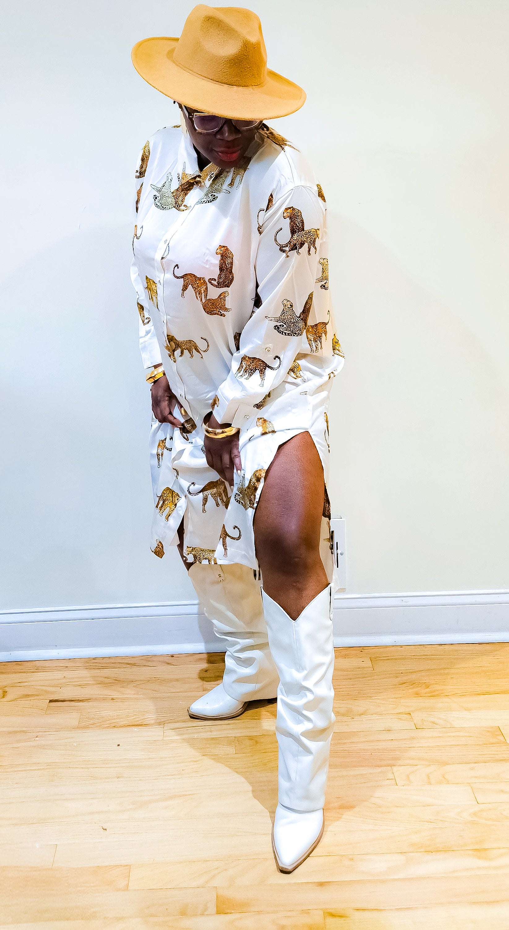 Satin like ;shirt dress w leopard prints;button up w collar; side splits;